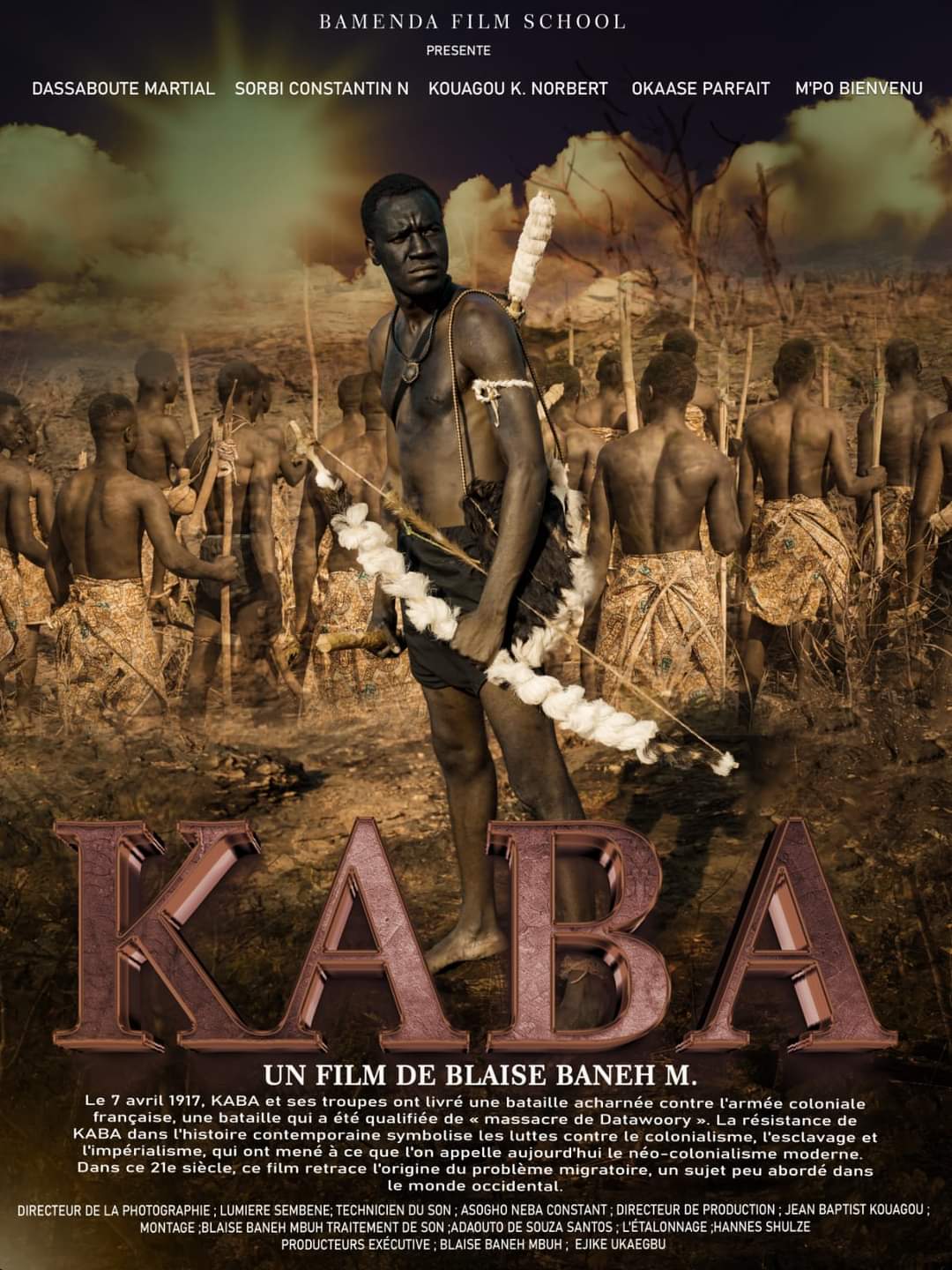 Le 7 Avril 1917, KABA et ses troupes ont livré une bataille acharnée contre l’armée coloniale française, une bataille qui a été qualifiée de « massacre de Datawoory ». La résistance de KABA dans l’histoire contemporaine symbolise les luttes contre le colonialisme, l’esclavage et l’impérialisme, qui ont mené à ce que l’on appelle aujourd’hui le néo-colonialisme moderne. Dans ce 21e siècle, ce film retrace l’origine du problème migratoire, un sujet peu abordé dans le monde occidental.